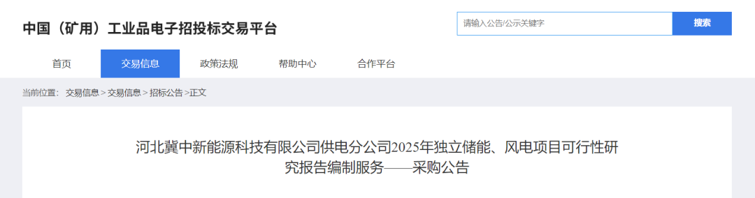 储能与电力市场获悉,4月22日,河北冀中新能源科技有限公司供电分公司2025年独立储能、风电项目可行性研究报告编制服务采购公告发布。采购人为河北冀中新能源科技有限公司供电分公司。