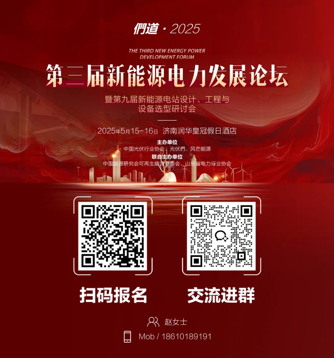 会议通知 ]article_adlist-->2025年5月15日-16日,第三届新能源电力发展论坛暨第九届新能源电站设计、工程与设备选型研讨会将在山东济南召开。 ]article_adlist-->本次会议将围绕新能源开发投资前端关注的关键话题,包括“十五五”规划方向、电力市场交易规则、行业发展趋势影响、开发建设与创新、源网荷储与绿电应用等话题展开探讨,共同推动行业持续发展。 ]article_adlist-->(会议详情可查看文末海报,扫描二维码报名参会)